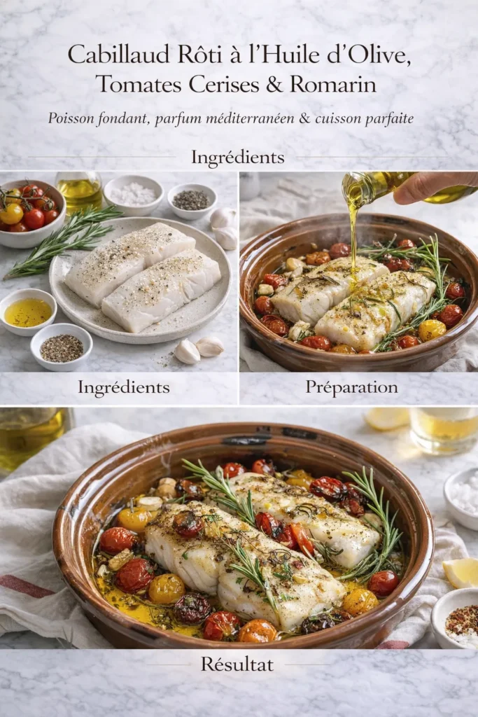 Le cabillaud rôti aux tomates cerises est un plat à la fois simple, sain et raffiné. La chair tendre du poisson s’accorde parfaitement avec la douceur acidulée des tomates rôties et le parfum des herbes méditerranéennes. Ce plat, prêt en quelques minutes, évoque la cuisine du sud et la fraîcheur des repas d’été.