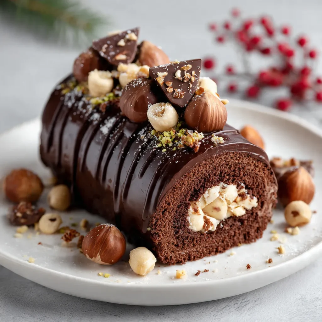 A chocolate hazelnut Yule log is the epitome of festive indulgence—a dessert that combines the richness of chocolate, the warmth of roasted hazelnuts, and the elegance of a traditional holiday cake. Known in French as “bûche de Noël,” this dessert has become a symbol of Christmas celebrations, representing warmth, family, and the joy of sharing something beautiful and delicious. The combination of a soft chocolate sponge, a silky hazelnut praline cream, and a glossy ganache glaze creates a dessert that is both visually stunning and irresistibly flavorful. Each bite offers a perfect balance of textures: the lightness of the sponge, the creaminess of the filling, and the smoothness of the chocolate coating.