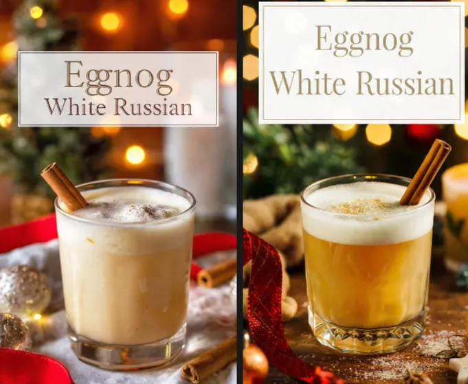 Classic Eggnog White Russian: Traditional version with vodka, coffee liqueur, and eggnog. Spiced Rum White Russian: Replace vodka with spiced rum for a warmer, richer flavor. Chocolate Eggnog White Russian: Add a splash of chocolate liqueur or cocoa powder. Peppermint White Russian: Add a few drops of peppermint extract or garnish with a candy cane. Vegan White Russian: Use dairy-free eggnog and plant-based coffee liqueur. Irish Eggnog White Russian: Replace vodka with Irish whiskey for a bold twist.