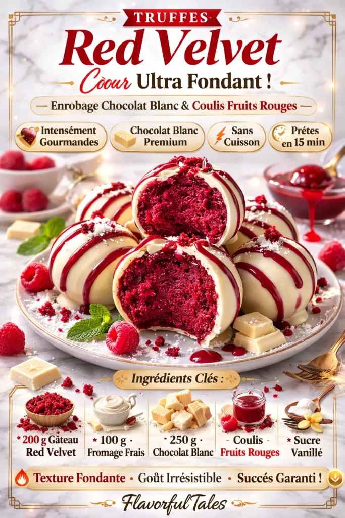 Ce dessert repose sur le contraste : le blanc pur du chocolat et le rouge vif du coulis. Ce jeu de couleurs attire le regard et évoque la passion, la douceur et la gourmandise. C’est une combinaison intemporelle, à la fois romantique et festive.