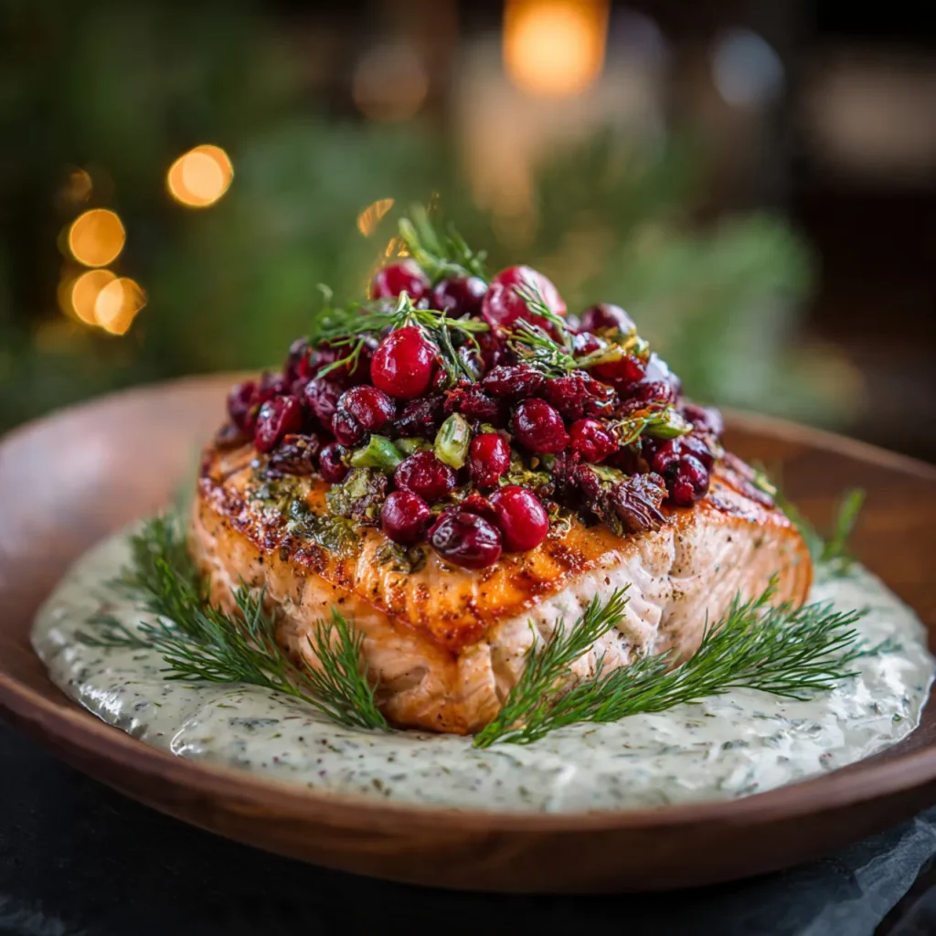 The combination of salmon and cranberries bridges the gap between land and sea, sweet and savory, tradition and innovation. The herb cream adds a touch of freshness that balances the richness of the fish, while the presentation makes it worthy of any festive occasion.