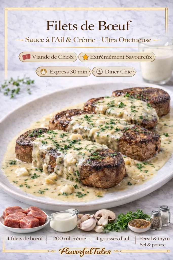 Ce plat allie la tendreté du bœuf à la richesse d’une sauce crémeuse et parfumée. L’ail, adouci par la cuisson, sublime la viande sans l’écraser. C’est une recette parfaite pour un dîner raffiné, rapide et plein de caractère.