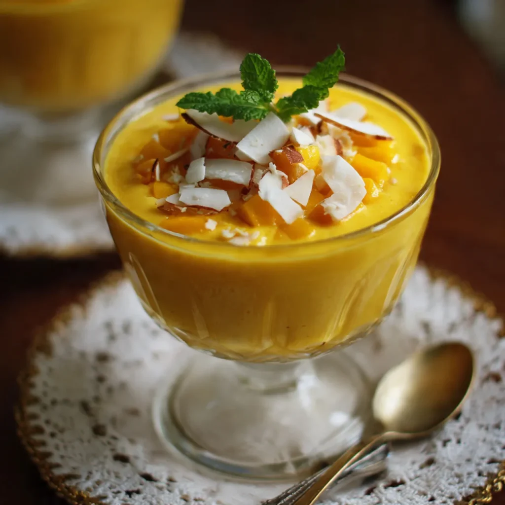 The perfect mango coconut pudding should be smooth, creamy, and lightly set. The texture should be soft enough to melt in the mouth but firm enough to hold its shape. The flavor should balance the sweetness of mango with the richness of coconut, creating a dessert that’s both refreshing and indulgent. The aroma of ripe mangoes and coconut milk should evoke the warmth of tropical sunshine, while the garnish adds freshness and texture.
