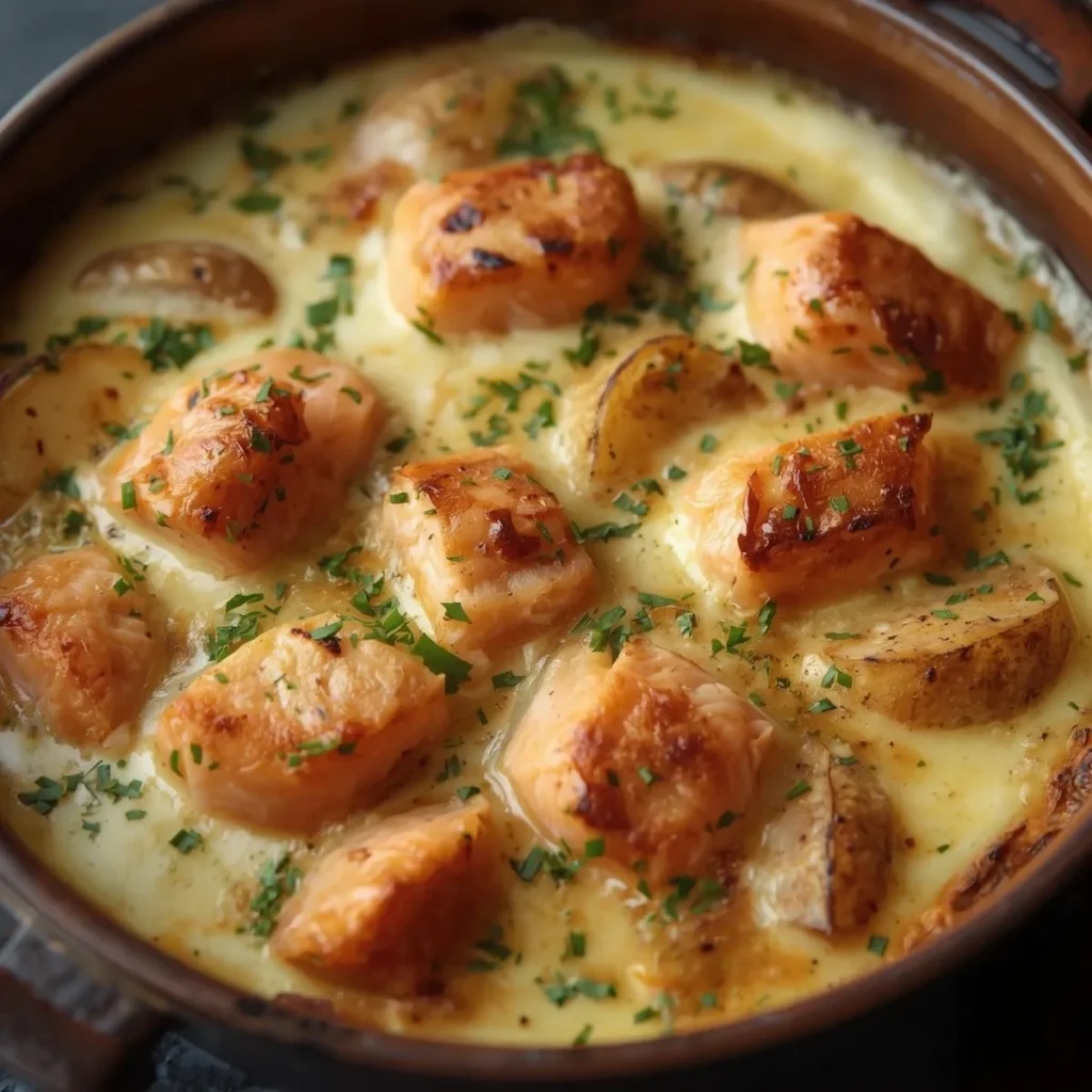 This dish is a modern twist on the traditional potato gratin, enriched with the addition of salmon. The fish adds a subtle sweetness and richness that pairs beautifully with the creamy sauce and soft potatoes. The gratin is baked until golden and bubbling, with a crisp top and a melt-in-the-mouth interior. It’s a dish that feels luxurious but is surprisingly easy to prepare, making it ideal for both everyday meals and special occasions.