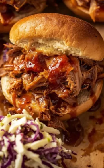 6. Assembler le sandwich : Garnir les buns avec le pulled pork, ajouter du coleslaw pour le croquant.