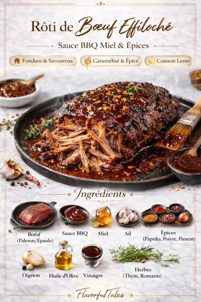Le rôti de bœuf effiloché à la sauce BBQ miel & épices est un plat généreux et réconfortant, idéal pour les repas en famille ou entre amis. Longuement mijotée, la viande devient si tendre qu’elle s’effiloche à la fourchette. Enrobée d’une sauce barbecue maison au miel et aux épices, elle offre un équilibre parfait entre douceur, fumé et piquant.